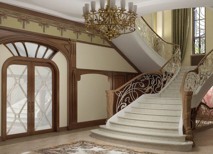 Eskailera moderno eta handiak dituen gela batera dekoratu nahi baduzu, eskaileretan edo hesietan egin behar da. Horrez gain, arku dekorazioko korridorean ere ongi etorriak daude, Art Nouveau estilokoak ere.