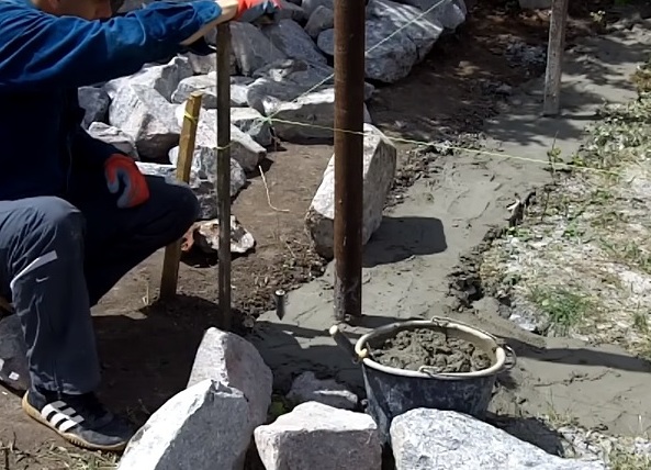 - Harlandua hesituta dago. Perimetroaren inguruan lehenengo errenkaria ezartzeko hasi behar duzu. Beheko geruza harri handiak hautatzen dira. Egoera guztiak irtenbidez betetzen dira. Beharrezkoa izanez gero, harrien ertzak jipoitu egin beharko lirateke, beraz, esate baterako, gorabeherak hobe dira.