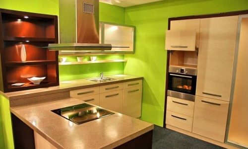 - Sukaldeetako argi berdea. Atzeko plano hori erabat egurrezko fatxada batekin harmonizatzen da, baita aurikular argi edo ilun kontrastatuak ere. Berdea kolore berde iluneko tonu ilunen saturatuak sukaldean efektu dinamikoa eta eraginkorra emango diote, eta argizko paletak gelan harmonia leuna eta freskoa sortuko du. Aukera honen arau bakarra altzari sinpleena aukeratzeko da.