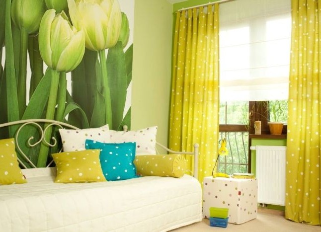 Horia paleta berdeko bizilagunaren kolorea da, eta, beraz, laguntzaile gisa egokituko du. Gortina urdina itxura aspergarria eta erraza da, beraz, logelak, sukaldeak eta haurtzaindegiak barrura sartzen dira. Berdea ez da ahaztu, gela batean nahastu ahal izango dituzun tonu ugari dituelako. Hormetako bat aukeratu daiteke, bestea gortinak eta ehunak.